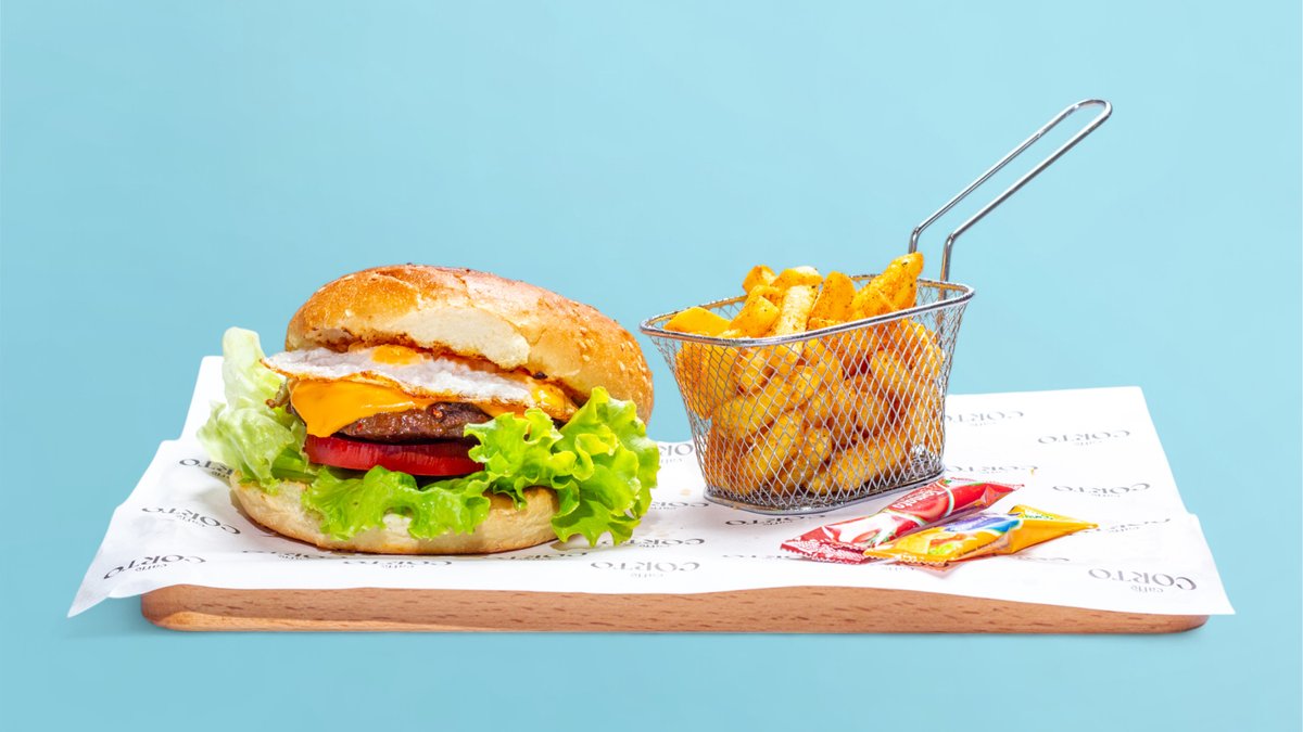 Burger, cheese, egg, green salad, tomatoes, pickles, french fries
