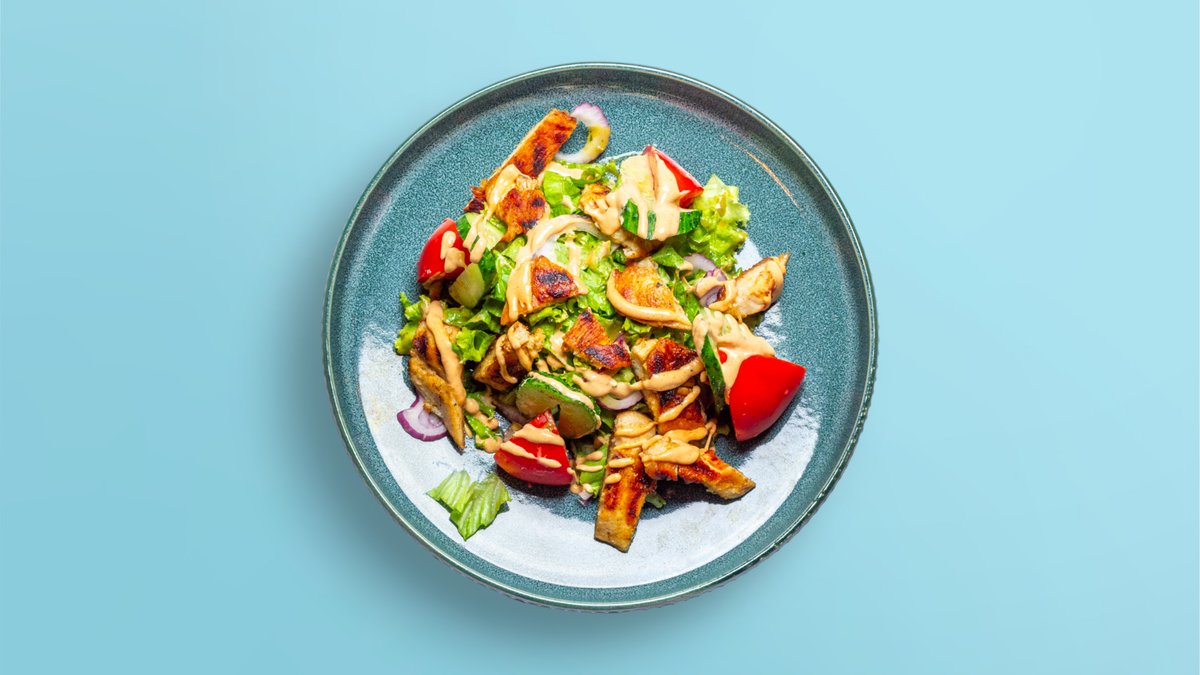 Roasted chicken, green salad, tomatoes, cucumbers, onions