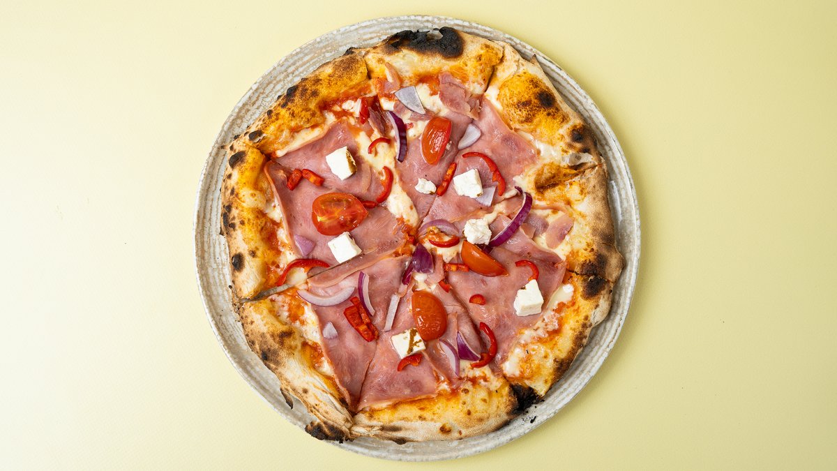 Sos domate, djathë, proshutë, feta, domatina, spec i kuq, qepë