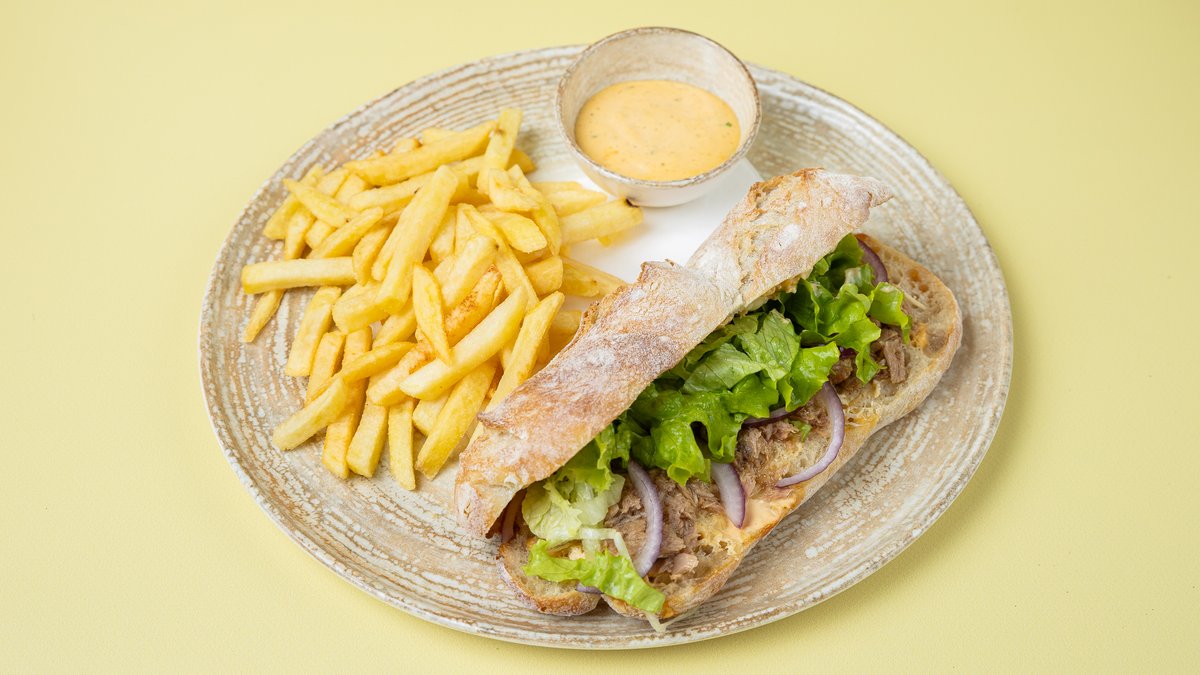 Tuna, qepë e kuqe, sos, pomfrit