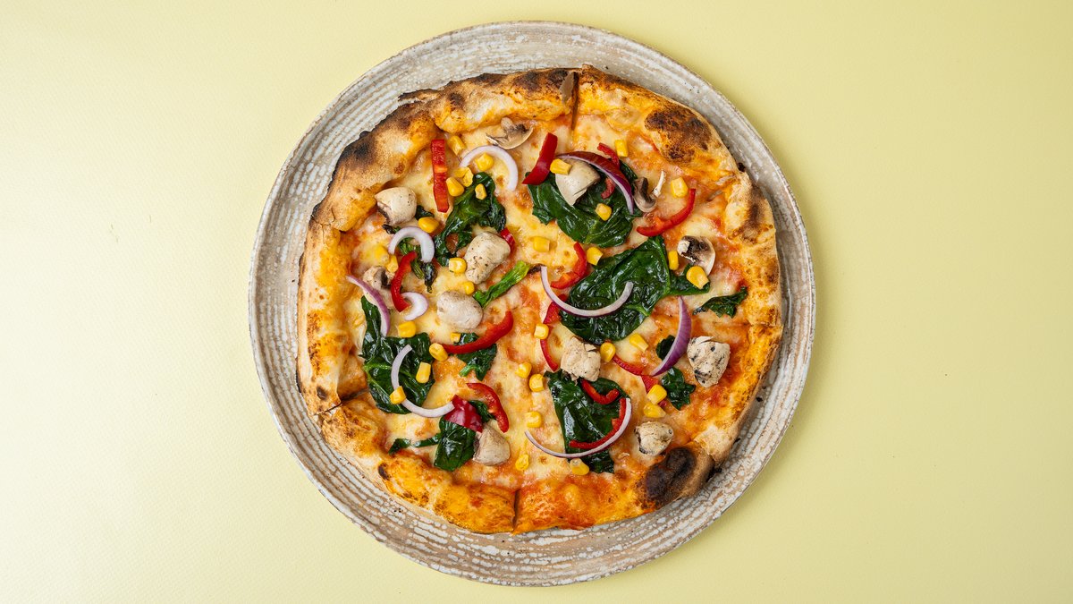 Sos domate, djathë, spec i kuq, qepë, kërpudha, misër, spinaq