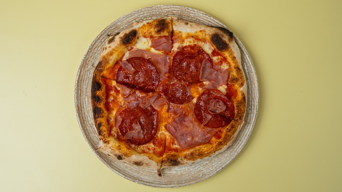 Sos domate, djathë, proshutë, suxhuk, mish i bluar, kërpudha, spec i kuq