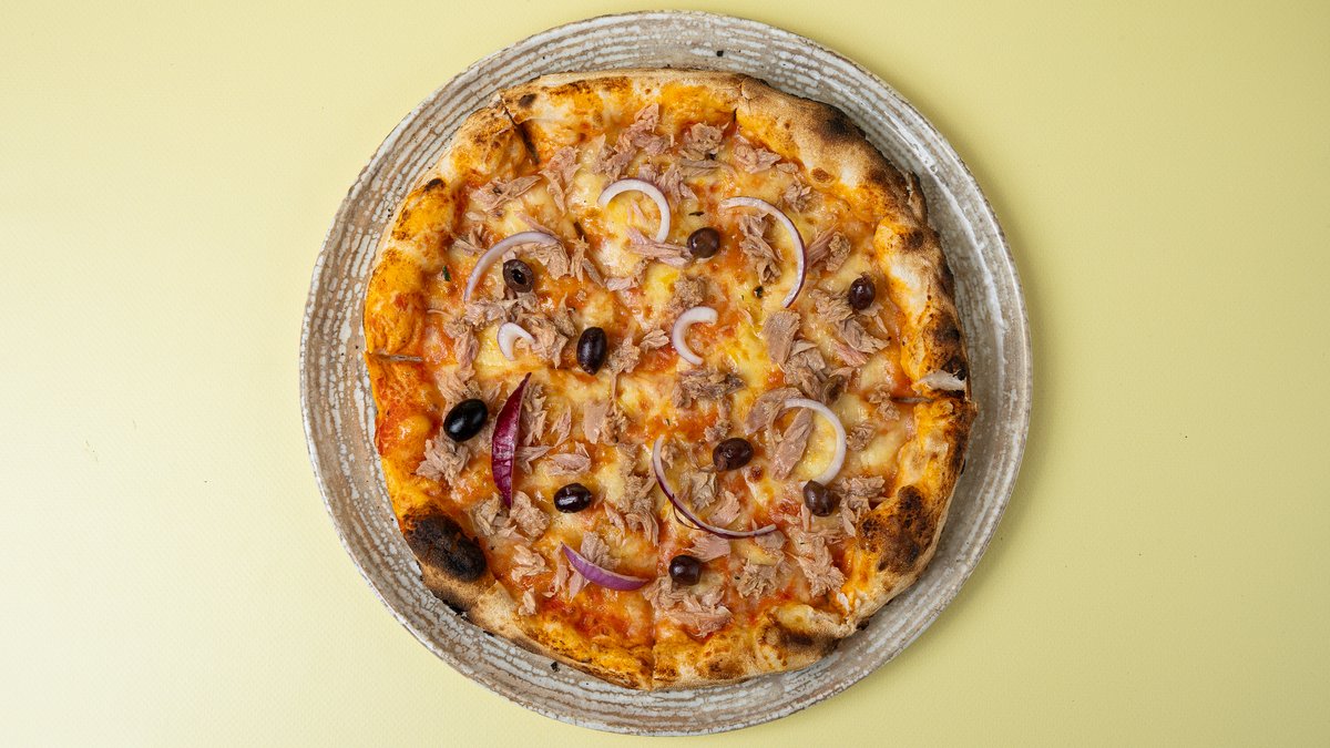 Sos domate, djathë, tuna, qepë, ullinj