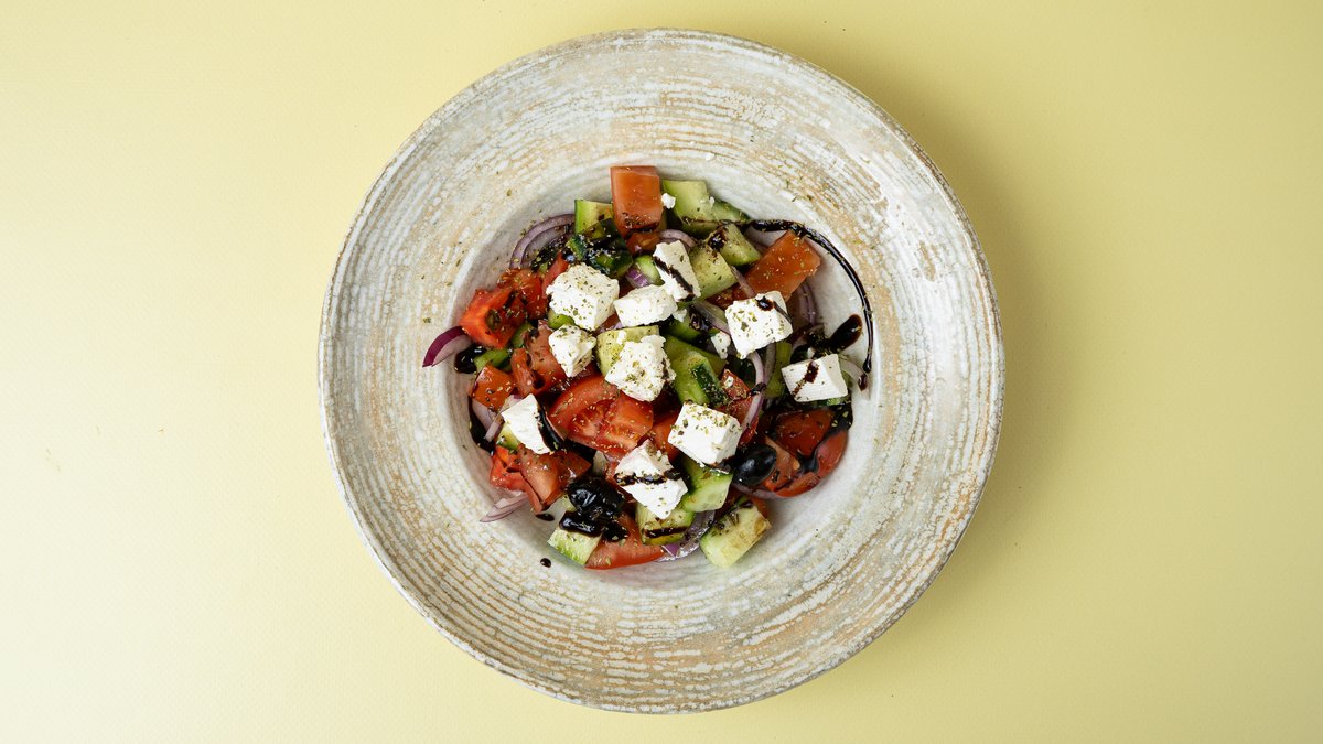 Domate, tranguj, ullinj kallamata, feta, vaj ulliri, qepë e kuqe