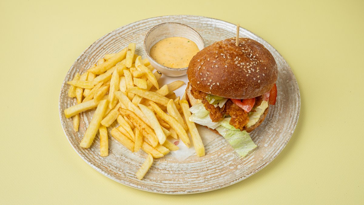 Mish pule, domate, tranguj turshi, sallatë e gjelbër, pomfrit