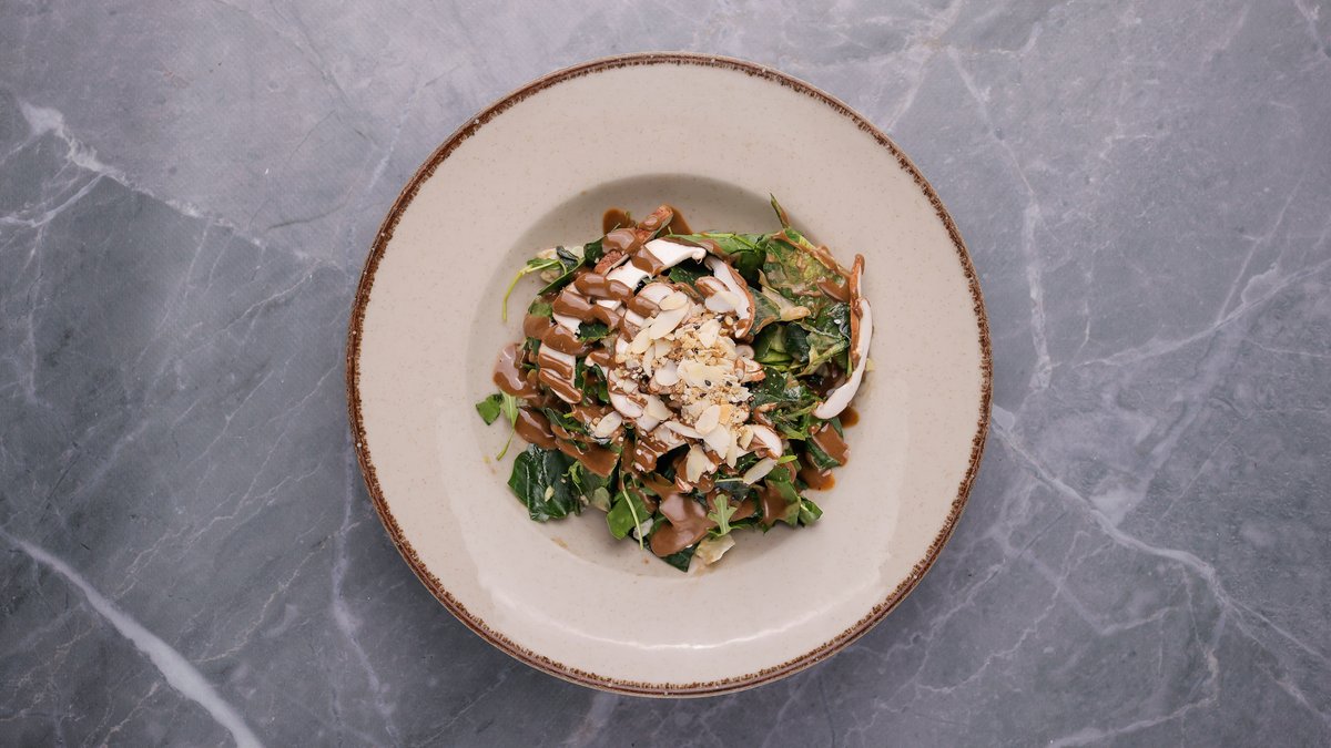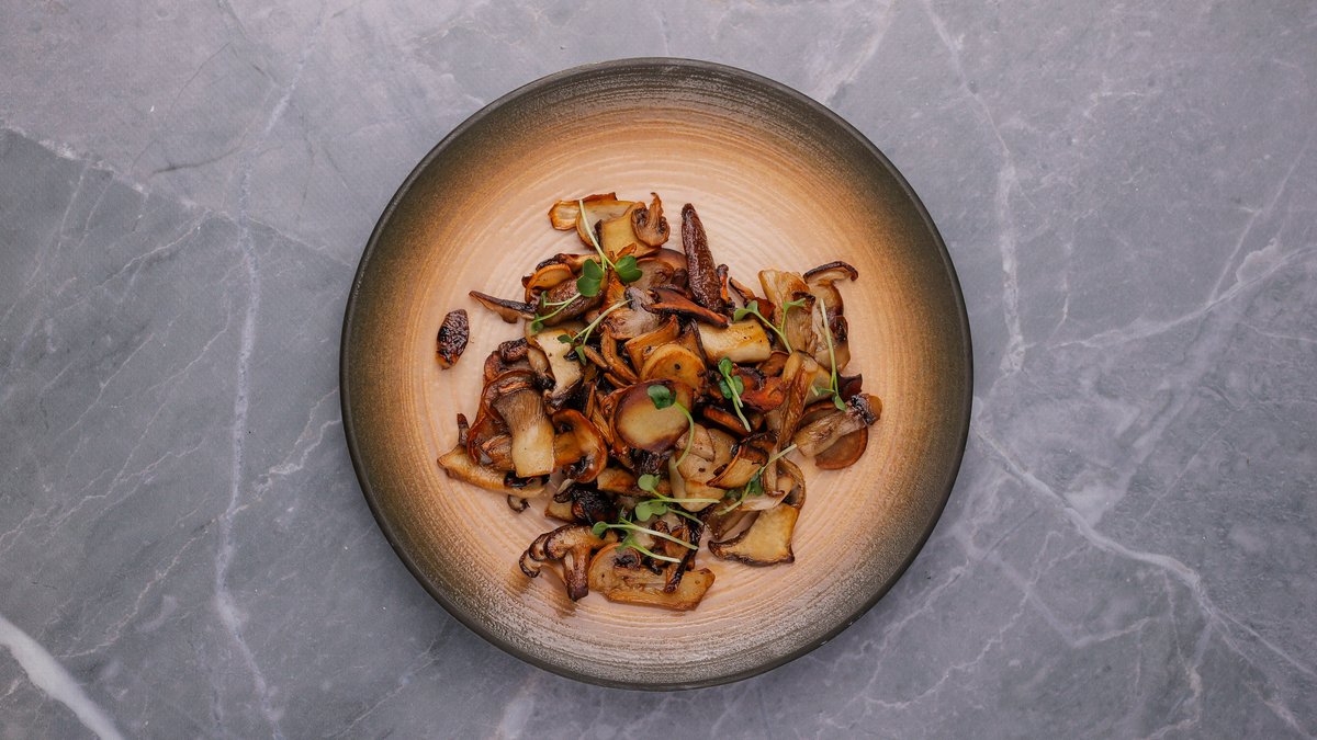 Këpurdha Shitake, qepë e kuqe, kaperi, ullinjë Kalamata, humus, salcë miso me portokall