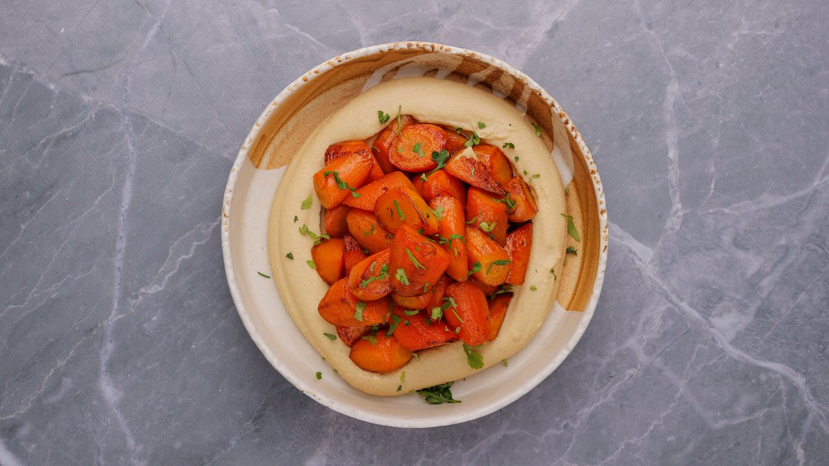 Humus qiqre, karrotë e karamelizuar.