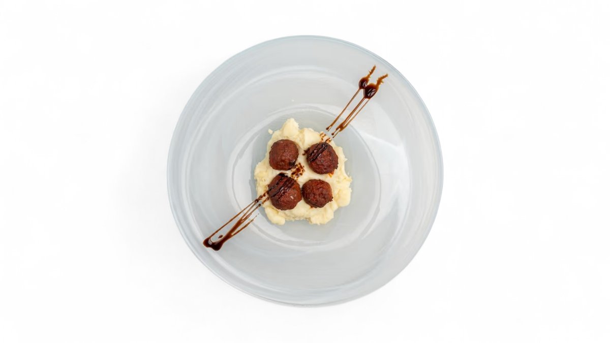 Qofte me sos domatesh, patate, sallatë mikse, pije