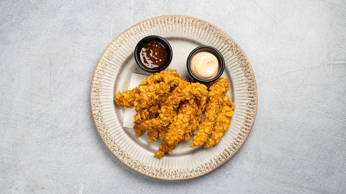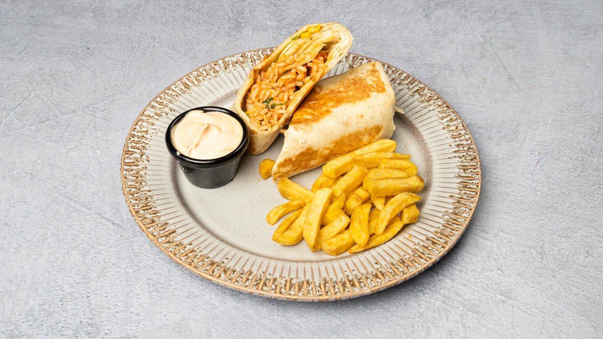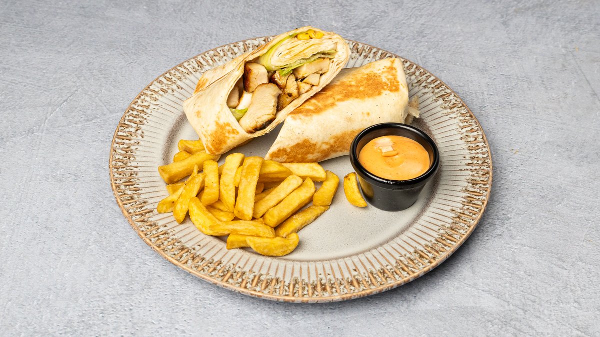 Mish pule, iceberg, speca, jalapenos, misër, patate të skuqura, sos