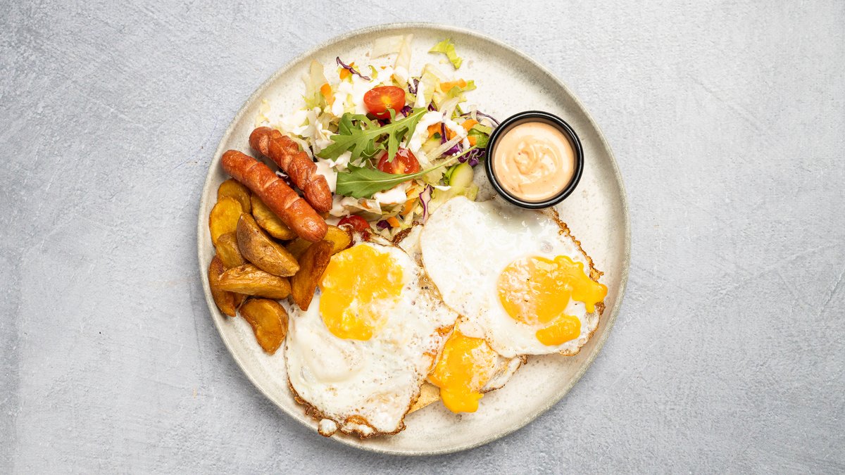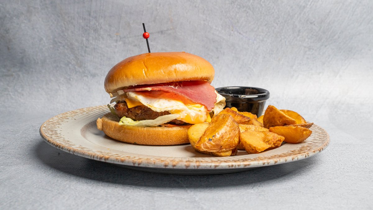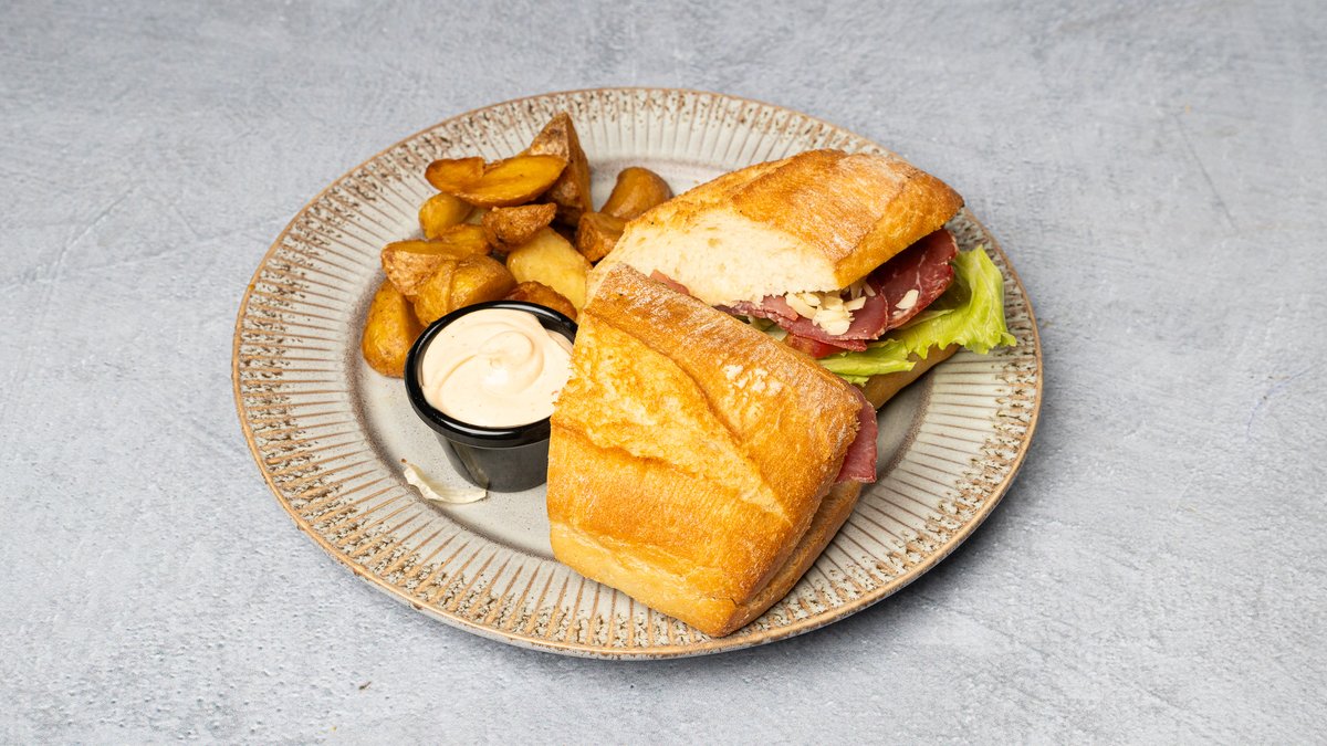 Proshutë viçi, kaçkavall, iceberg, domate, tranguj turshi, patate të skuqura, sos