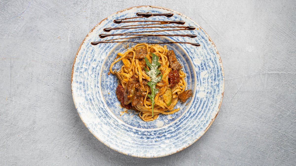 Biftek, kungulleshë, domate të thara, parmezan, hudhër
