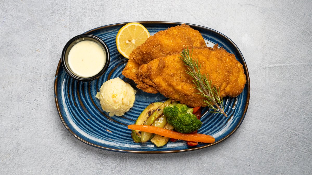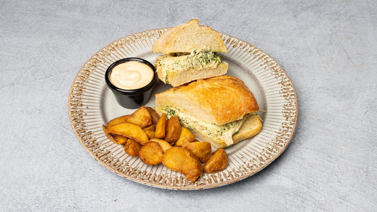 Mish pule, iceberg, domate, tranguj turshi, pesto, patate të skuqura, sos