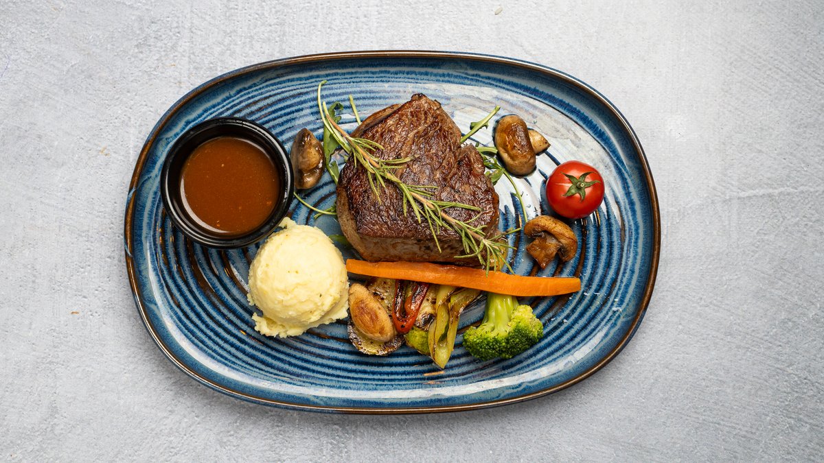 Biftek, karrota, spec i kuq, brokoli, kërpudha, pire, sos, rozmarinë
