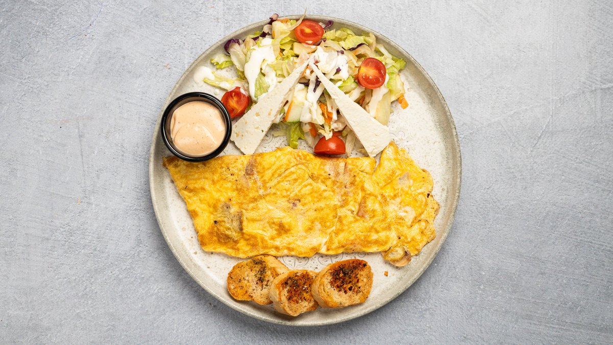 Vezë, spinaq, proshutë viçi, sallatë jeshile, sos holandez