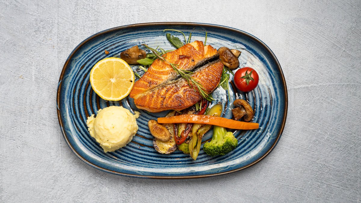 Salmon, karrota, spec i kuq, brokoli, kërpudha, pire, rozmarinë
