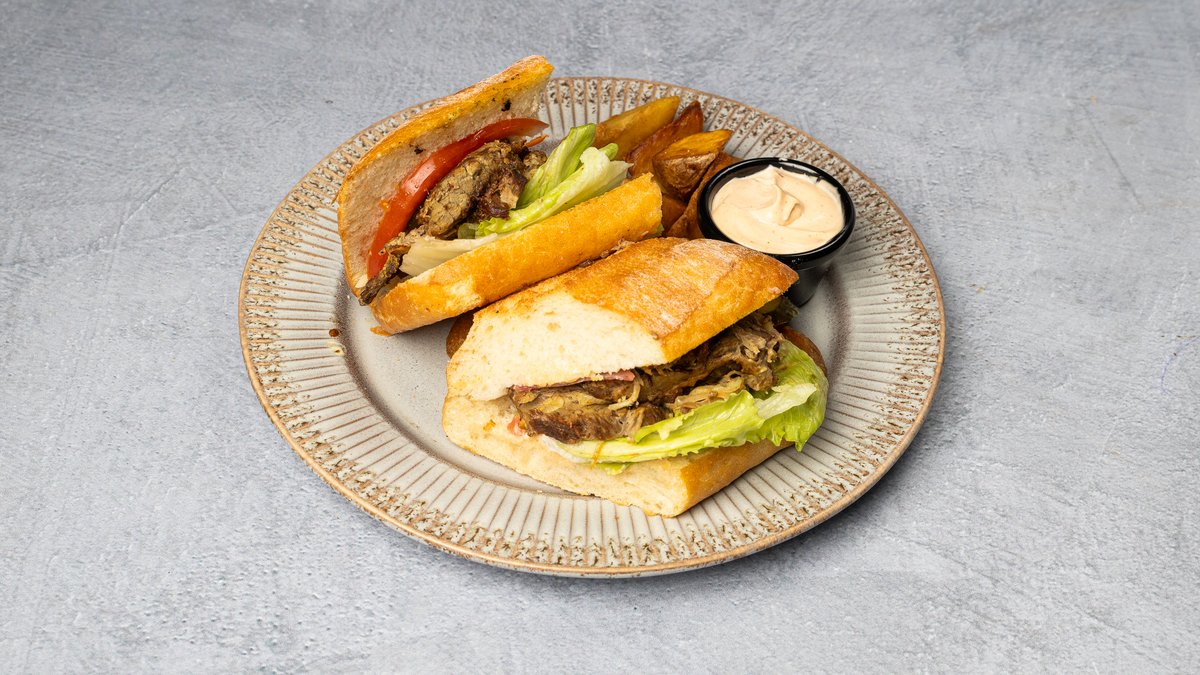 Mish viçi, kaçkavall, iceberg, domate, tranguj turshi, patate të skuqura, sos