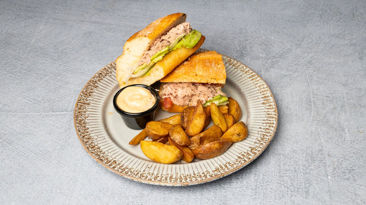 Ton, iceberg, domate, tranguj turshi, qepë, patate të skuqura, sos