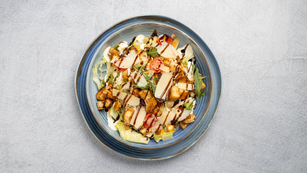 Mish pule, iceberg, domate, karrota, krutona, sos, parmezan