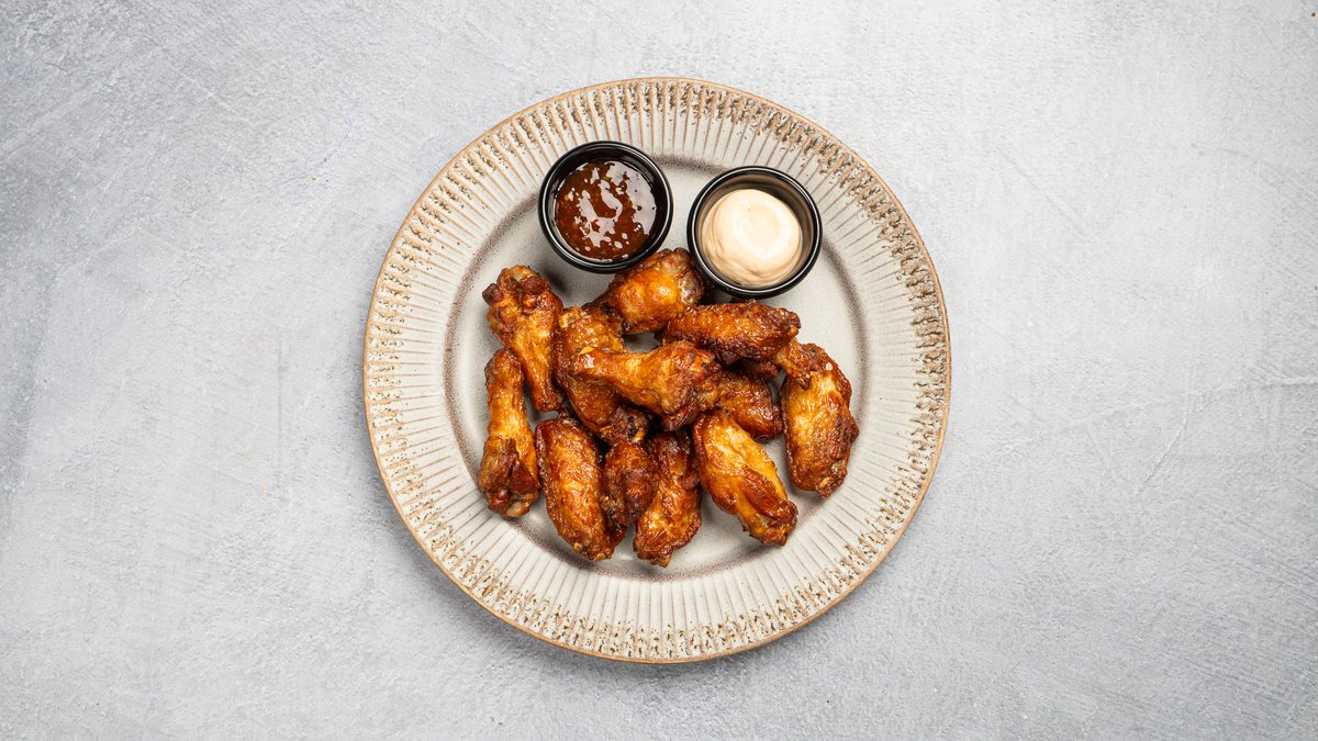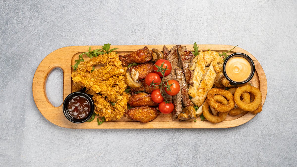 Ramstek viçi, mish pule, chicken wings, kërpudha, sos