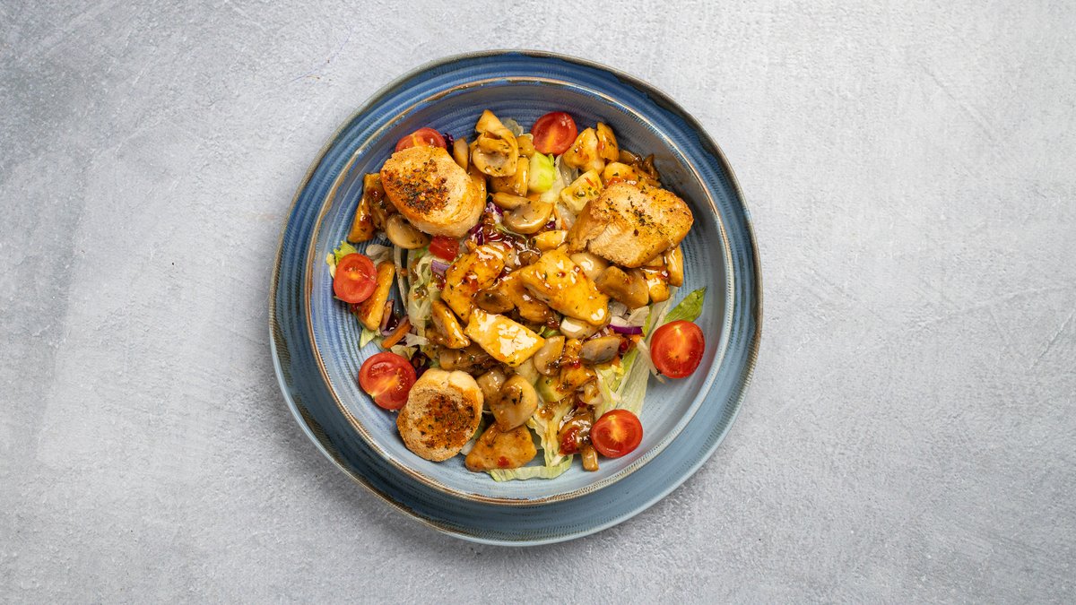 Mish pule, domate, tranguj, karrota, iceberg, kërpudha, sweet chili