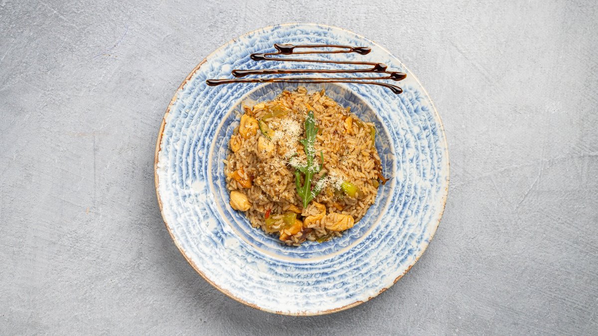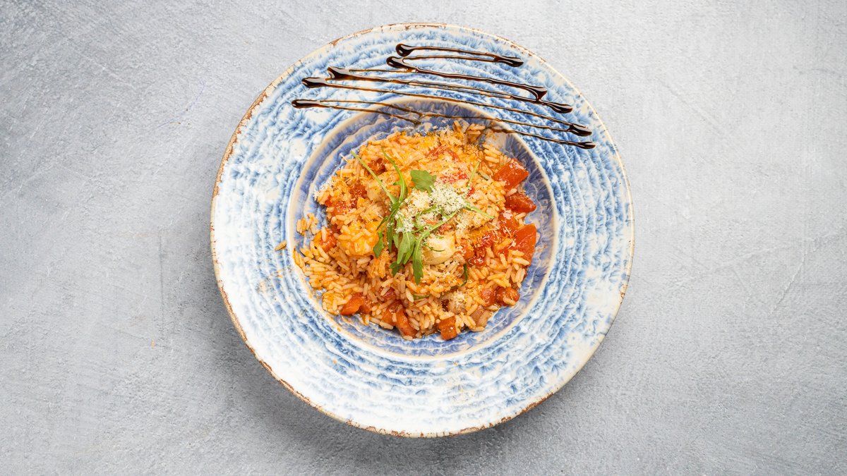 Mish pule, oriz, misër, fasule, kaçkavall, jalapenos, patate të skuqura, sos i kuq