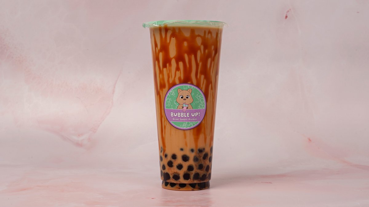 Kreemjas karamelli siirup, Piim, kohvi konsentraat kofeiiniga, sinu valikul boba lisandid Kui soovid tapioka, vaata lisandite menüü