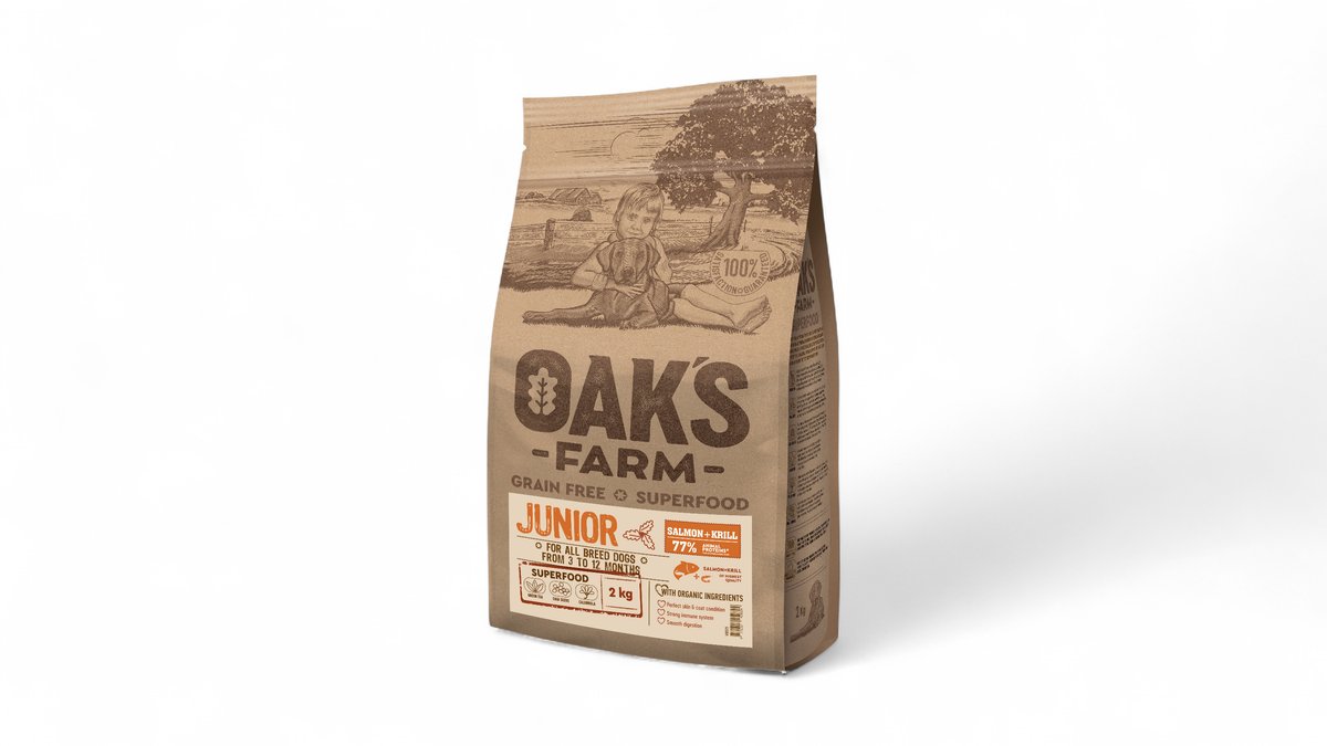 OAK'S FARM Grain Free Salmon with Krill Junior All Breed Dogs 2 kg, teraviljavaba kuivtoit igat tõugu noortele koertele, lõhe ja krilliga