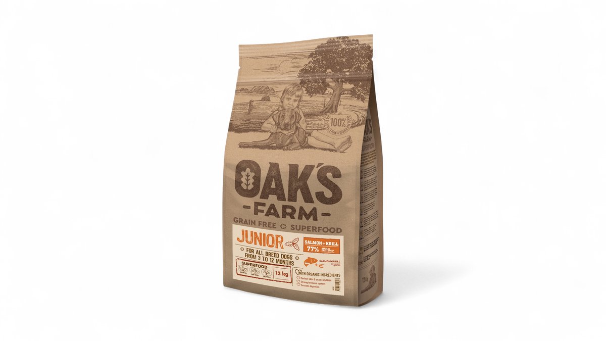 OAK'S FARM Grain Free Salmon with Krill Junior All Breed Dogs 12 kg, teraviljavaba kuivtoit igat tõugu noortele koertele, lõhe ja krilliga