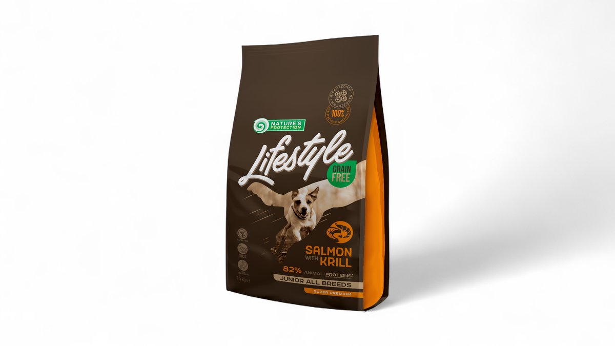 Nature's Protection Lifestyle Grain Free Salmon with Krill Junior All Breeds 1,5 kg, teraviljavaba kuivtoit igat tõugu noortele koertele, lõhe ja krilliga