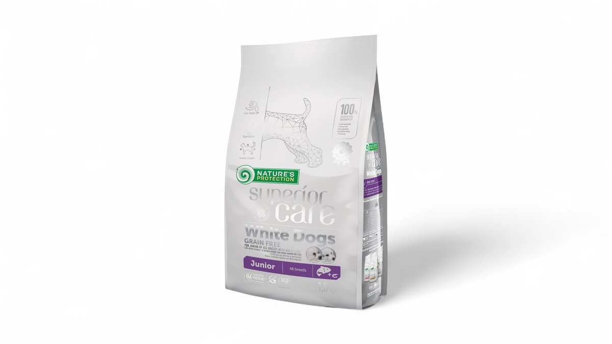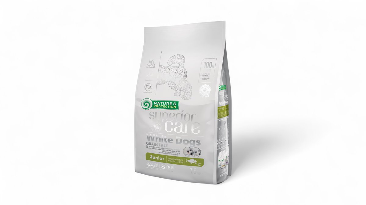 Nature's Protection Superior Care White Dogs Grain Free White Fish Junior Small and Mini Breeds 1,5 kg, teraviljavaba kuivtoit noortele väikestele ja üliväikestele valgekarvalistele koertele, valge kalaga