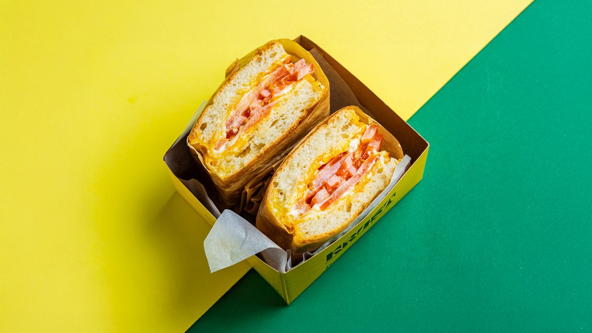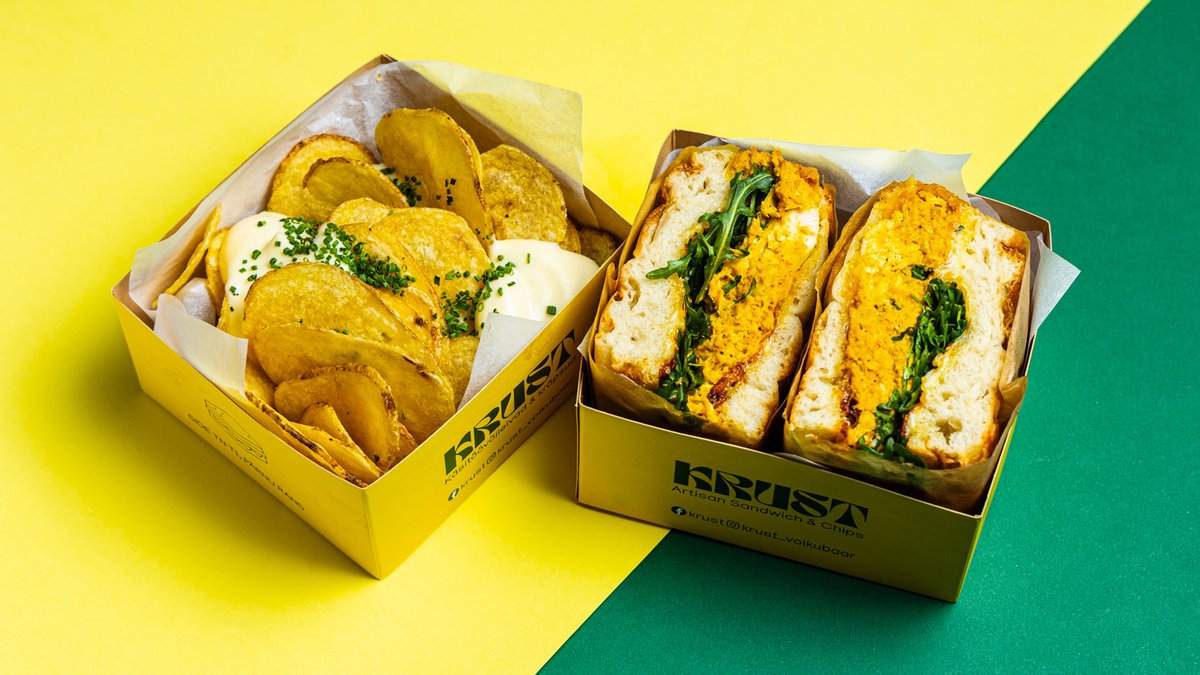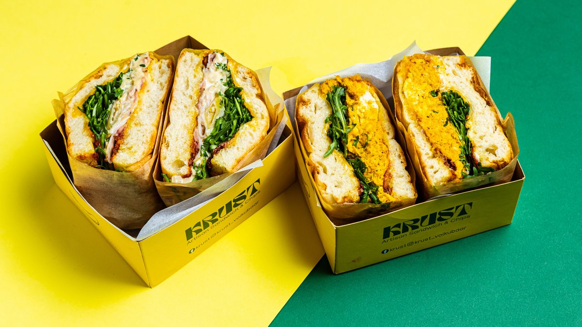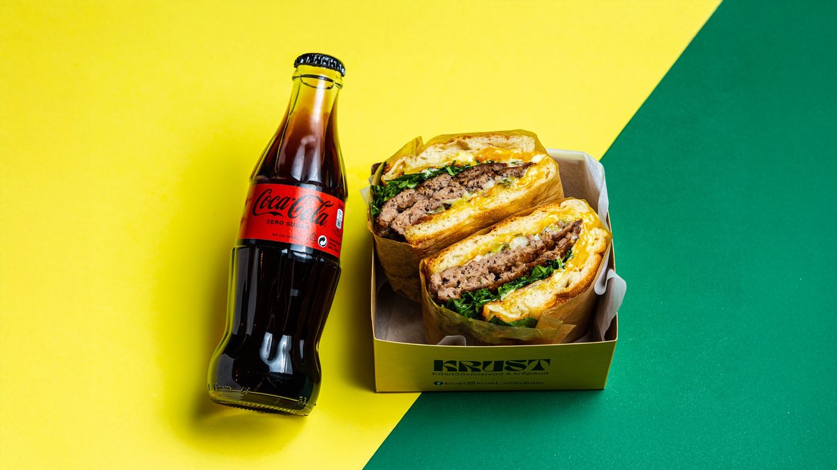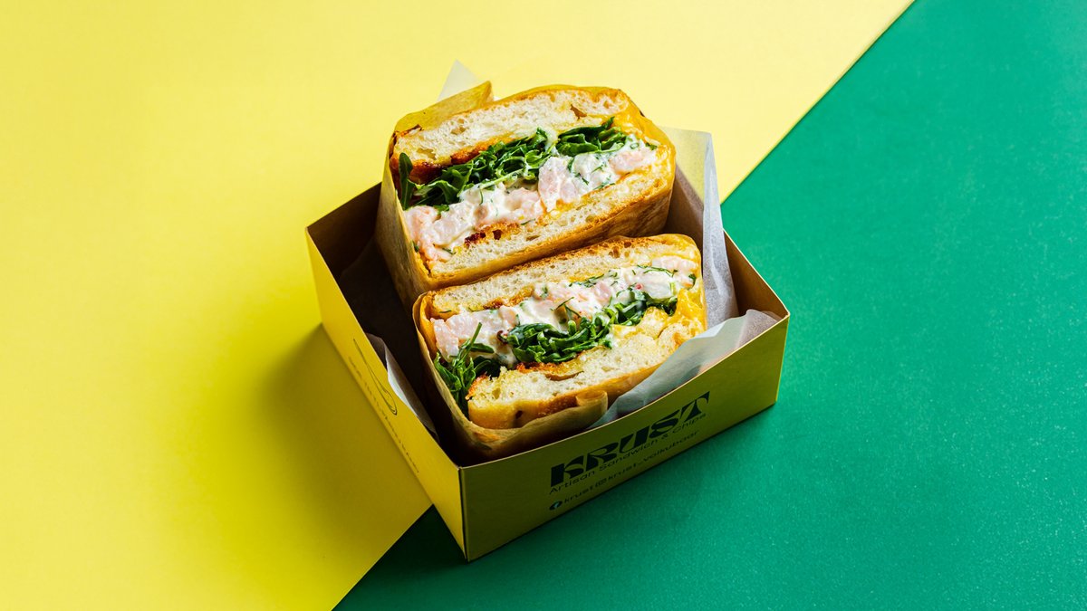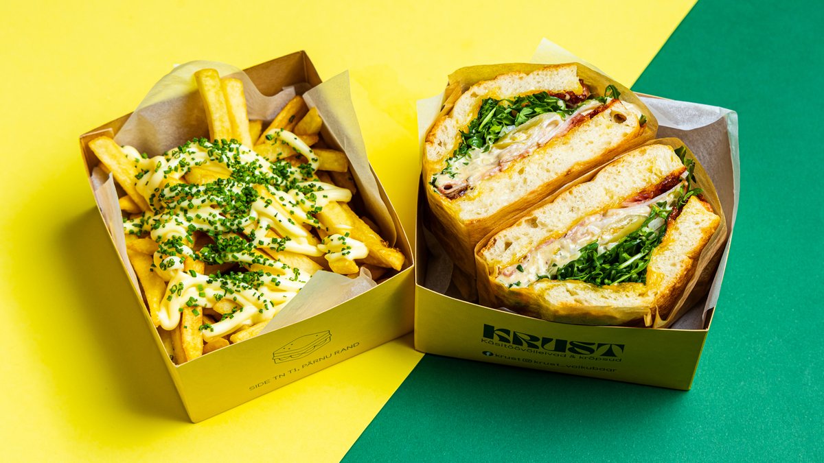Skagener (Focaccia ahjusai, juust, rukola, krevetisalat küüslaugumajoneesi, sinepi, värske tilli, sidruni ja sibulaga) + Okla Chop (Focaccia ahjusai, lihaveise smash-pihv, juust, sibul, Krusti majonees, marineeritud kurk ja rukola)