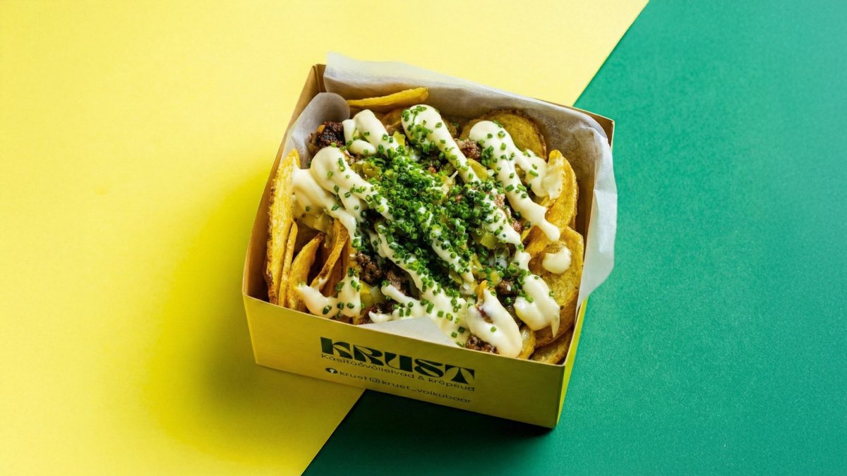 Laetud kartulikrõpsud lihaveise smash-pihv, juust, sibul, Krusti majonees, marineeritud kurk