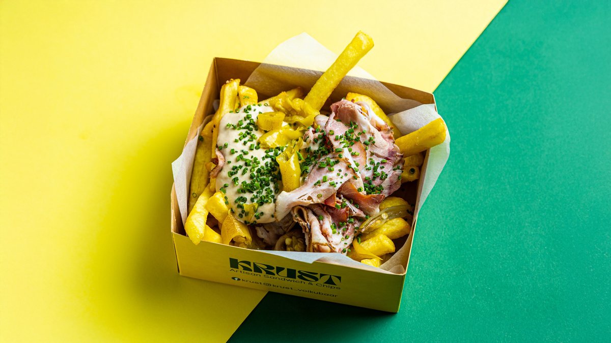 Skagener - (Focaccia ahjusai, juust, rukola, krevetisalat küüslaugumajoneesi, sinepi, värske tilli, sidruni ja sibulaga) + Laetud friikad - BBQ-suitsusiga, pepperoni, sibul, tuunikalakaste
