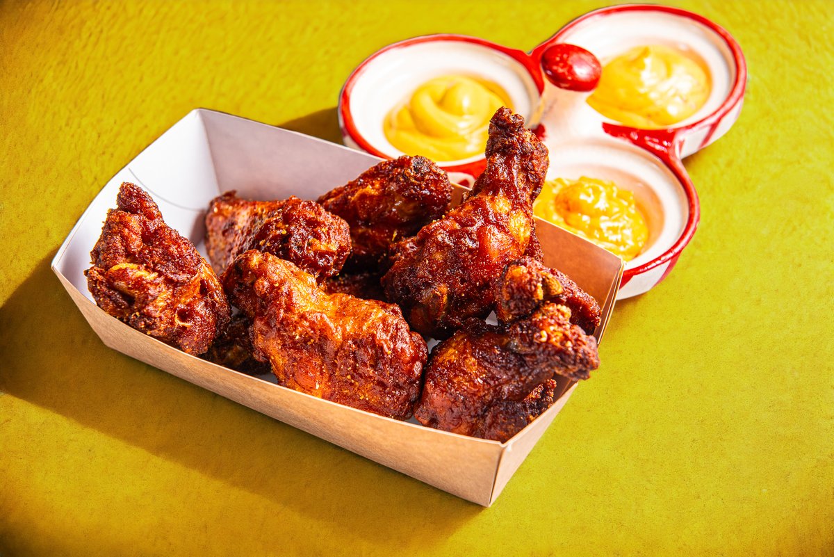 Grillitud kana, veisehakkliha, kodused marineeritud kurgid, kodune marineeritud sibul, tomat, friikartulid, salat, kaste