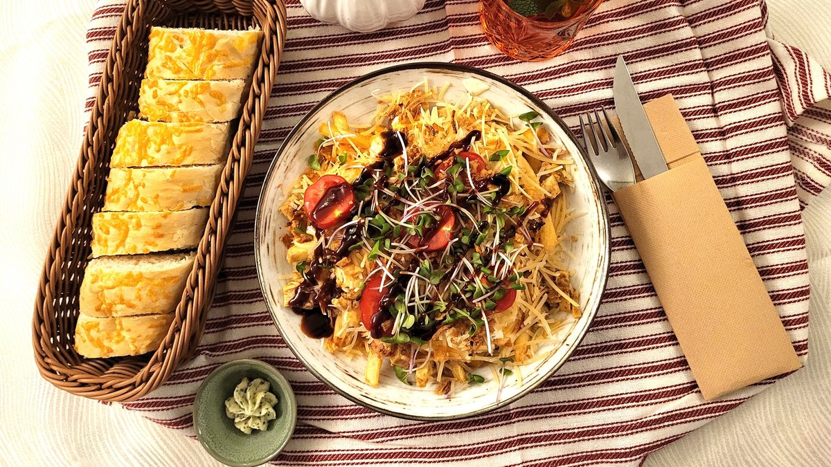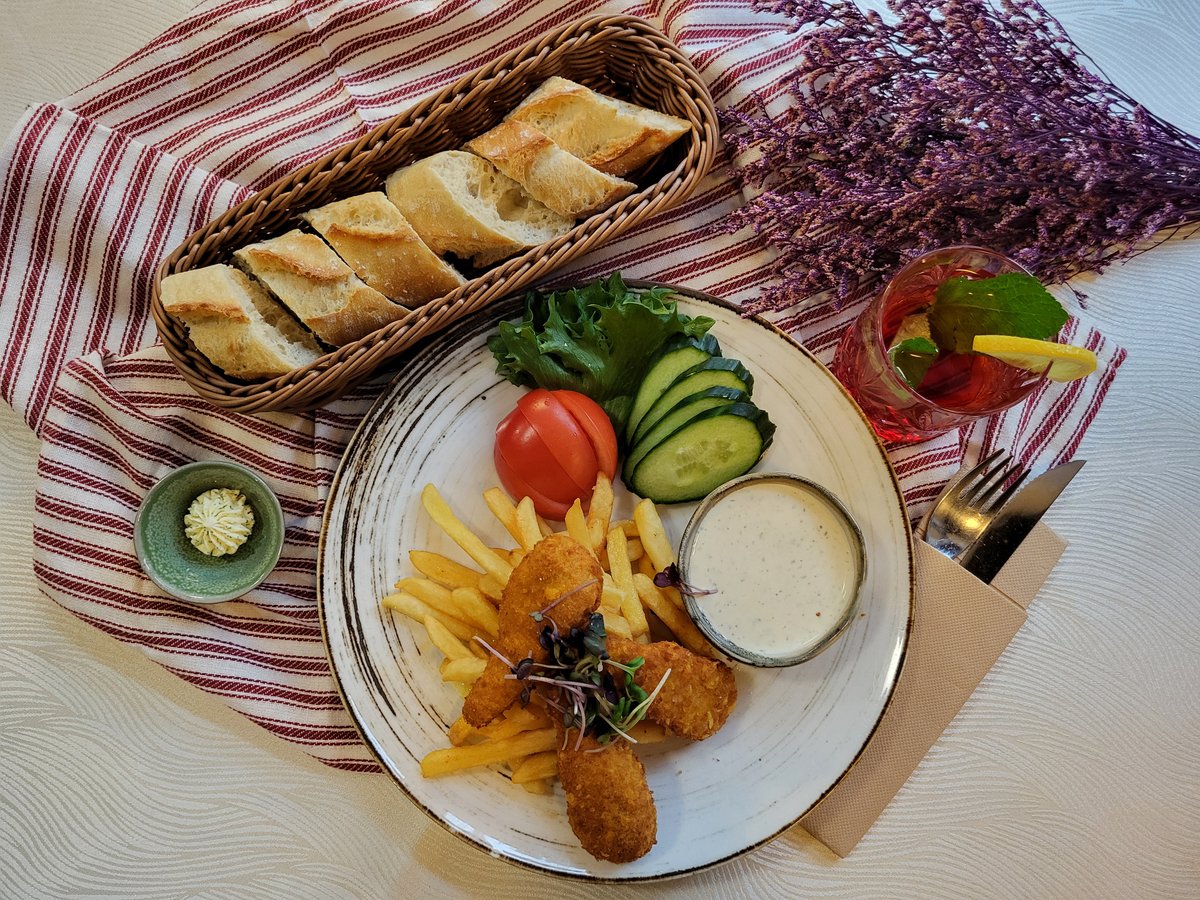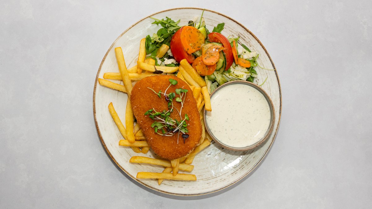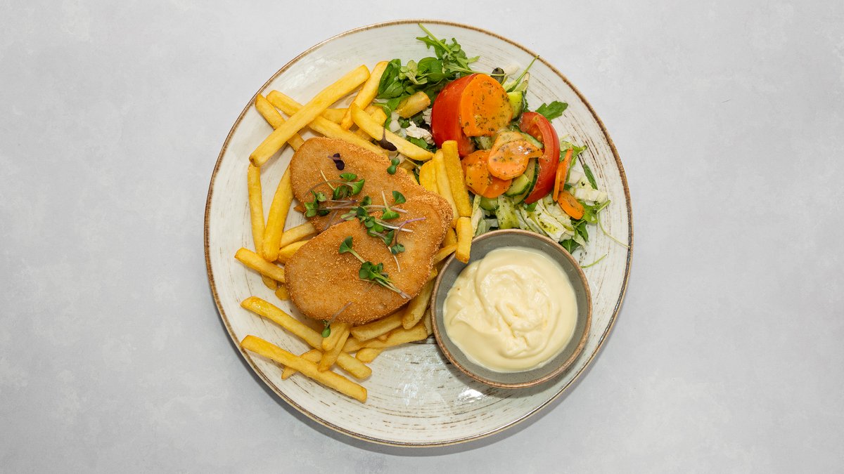 Juustušnitsel, friikartulid ja külmkaste