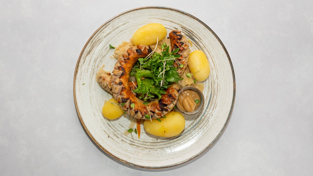 Grillitud bratwurst hapukapsa ja keedukartulitega