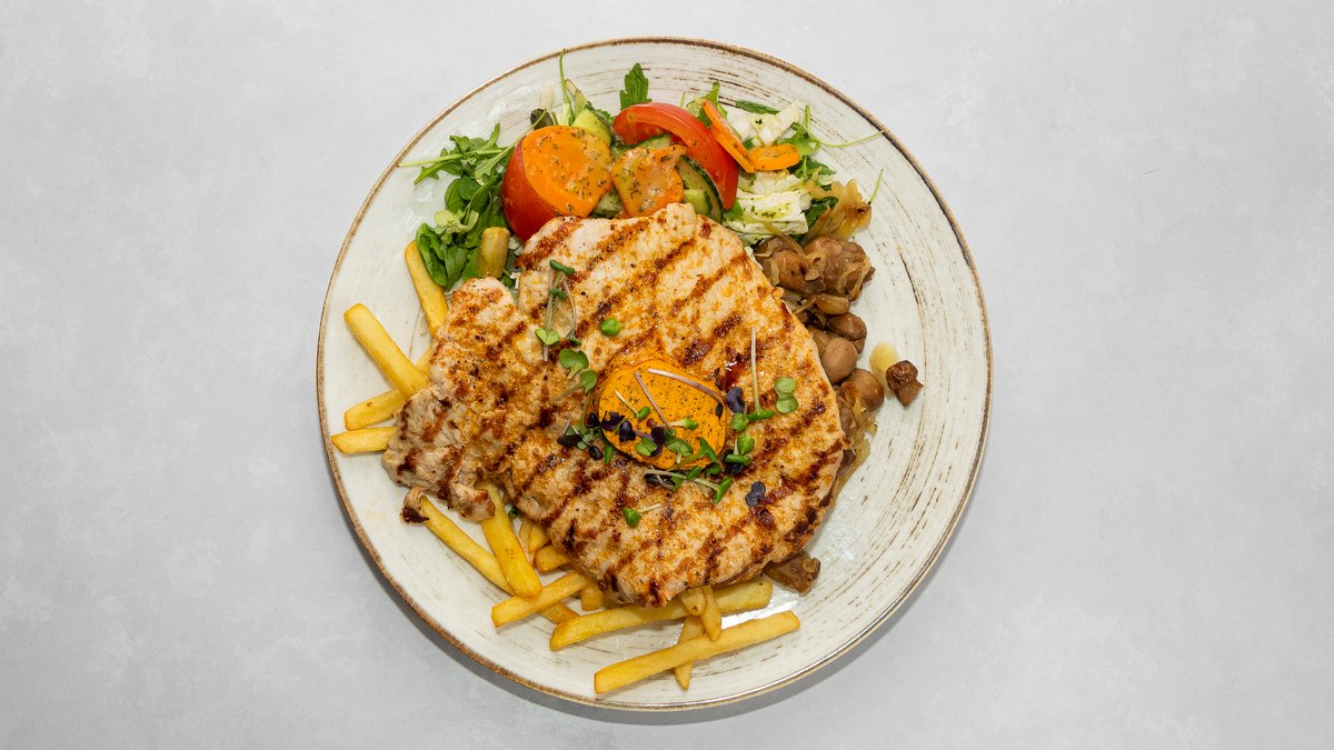 Grillitud sea välisfilee, seened sibulaga, maitsevõi ja friikartulid