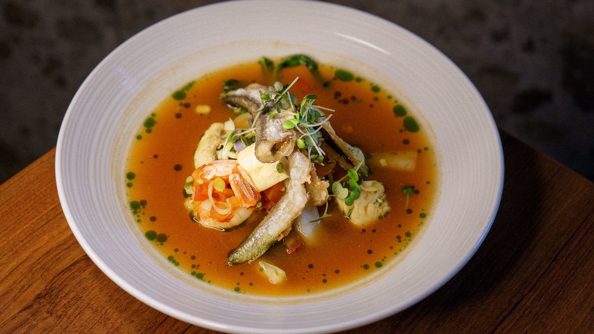 bouillabaisse puljong, krõbe tint, tiigerkrevett, merikoger, paksoi, sibul