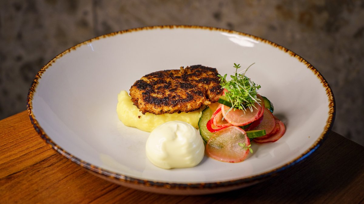 Kartuli-trühvlipüree, grillitud mais, kapsa-kurgisalat