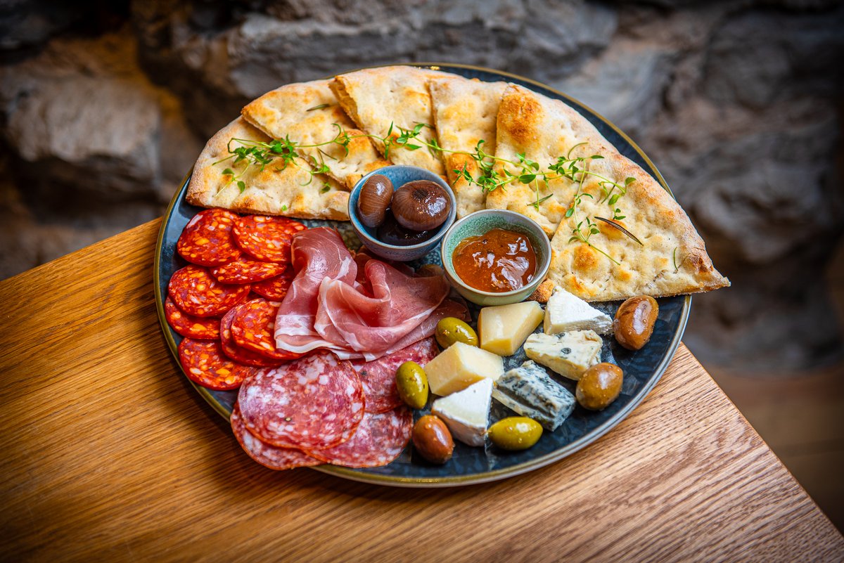 Erinevate juustude, salaamide ja sinkide valik serveeritud Amici sibulamoosi, passionimoosi ja grissinidega