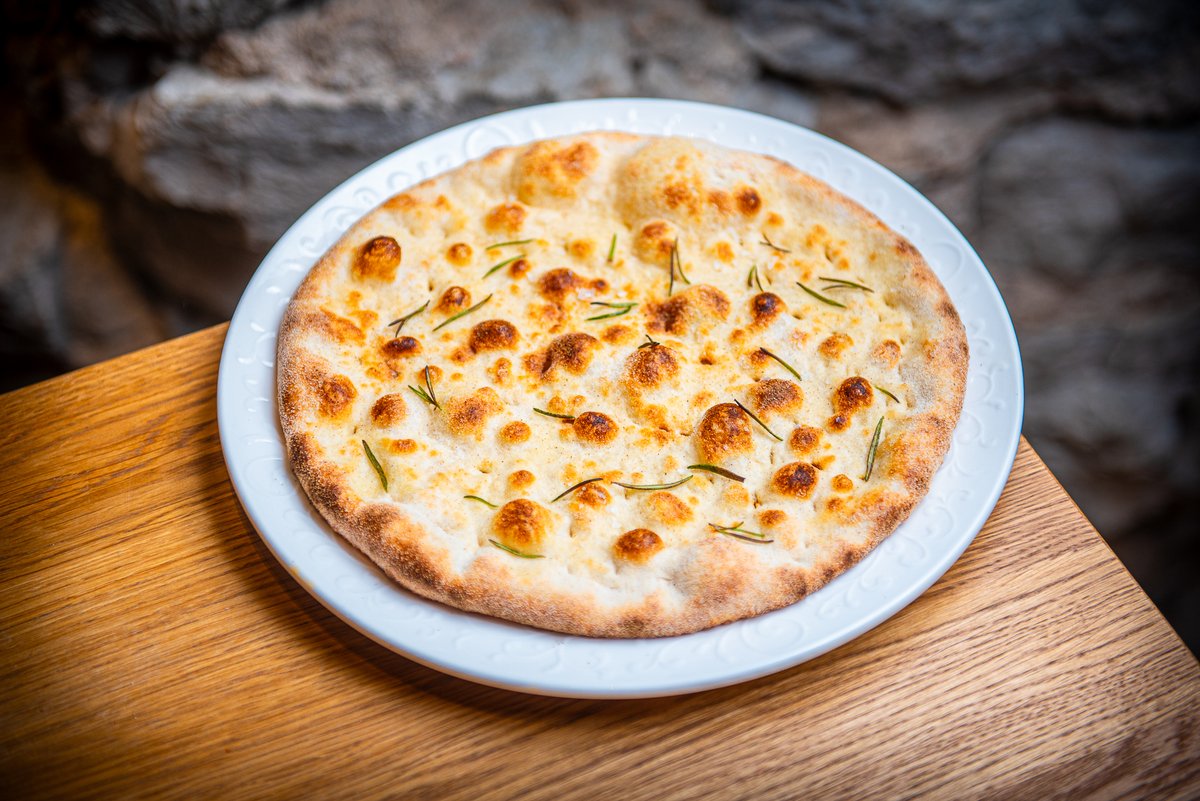 Tomatikaste, mozzarella, gorgonzola, Parmigiano Reggiano, pecorino Tomato sauce, fior di latte, gorgonzola, Parmigiano Reggiano, and Pecorino cheese