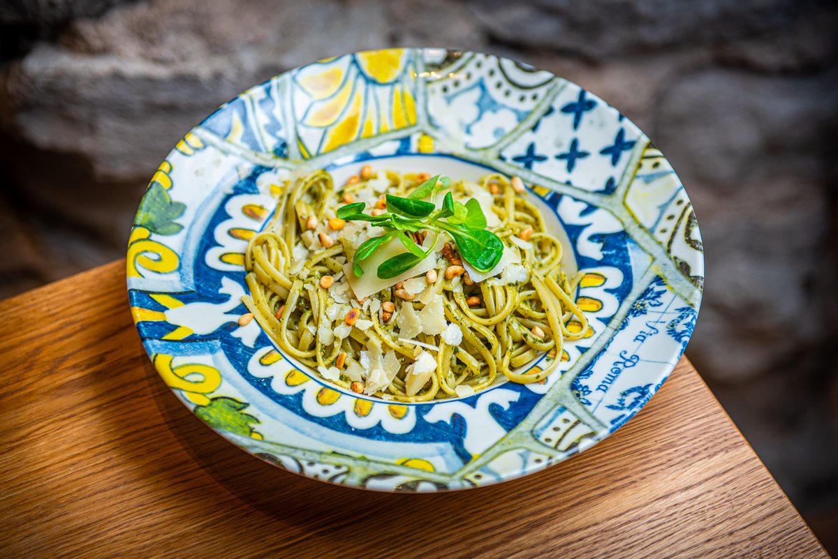 Linguine pasta basiilikupesto, seedermänni seemnete ja Parmigiano Reggianoga Linguine pasta with basil pesto, pine nuts and Parmigiano Reggiano