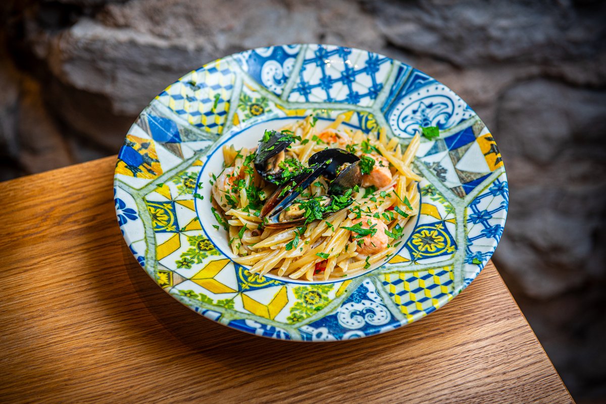 Trofie pasta valge veini-võikastmes mereandide, küüslaugu ja tšilliga Trofie pasta with seafood, garlic and chili in a white wine-butter sauce