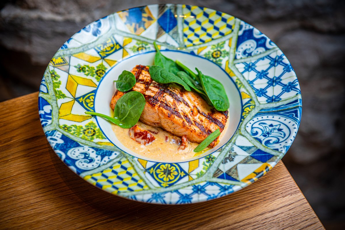 Grillitud lõhefilee spinati, päikesekuivatatud tomatite ja parmesaniga kooreses kastmes Grilled salmon in a cream sauce with spinach, sun-dried tomatoes and parmesan