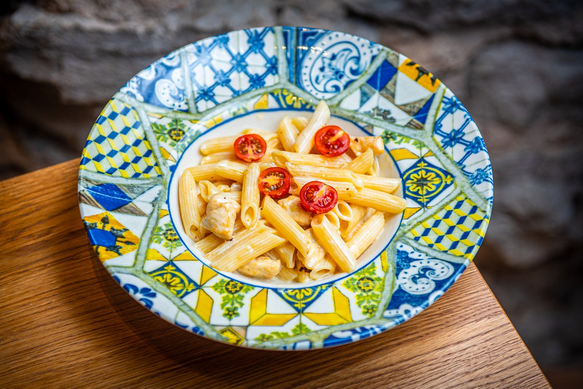 Penne pasta maisikana filee, grillitud suvikõrvitsa ja päikesekuivatatud tomatitega gorgonzola kastmes / Penne pasta with corn-fed chicken, grilled zucchini and sun-dried tomatoes in gorgonzola sauce