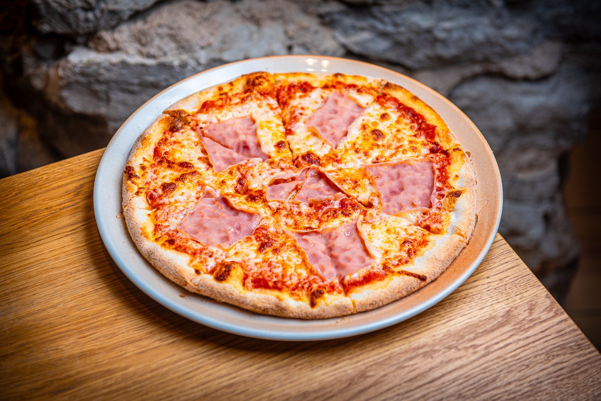 Tomatikaste, mozzarella, Itaalia sink, värske basiilik Tomato sauce, fior di latte, Italian ham