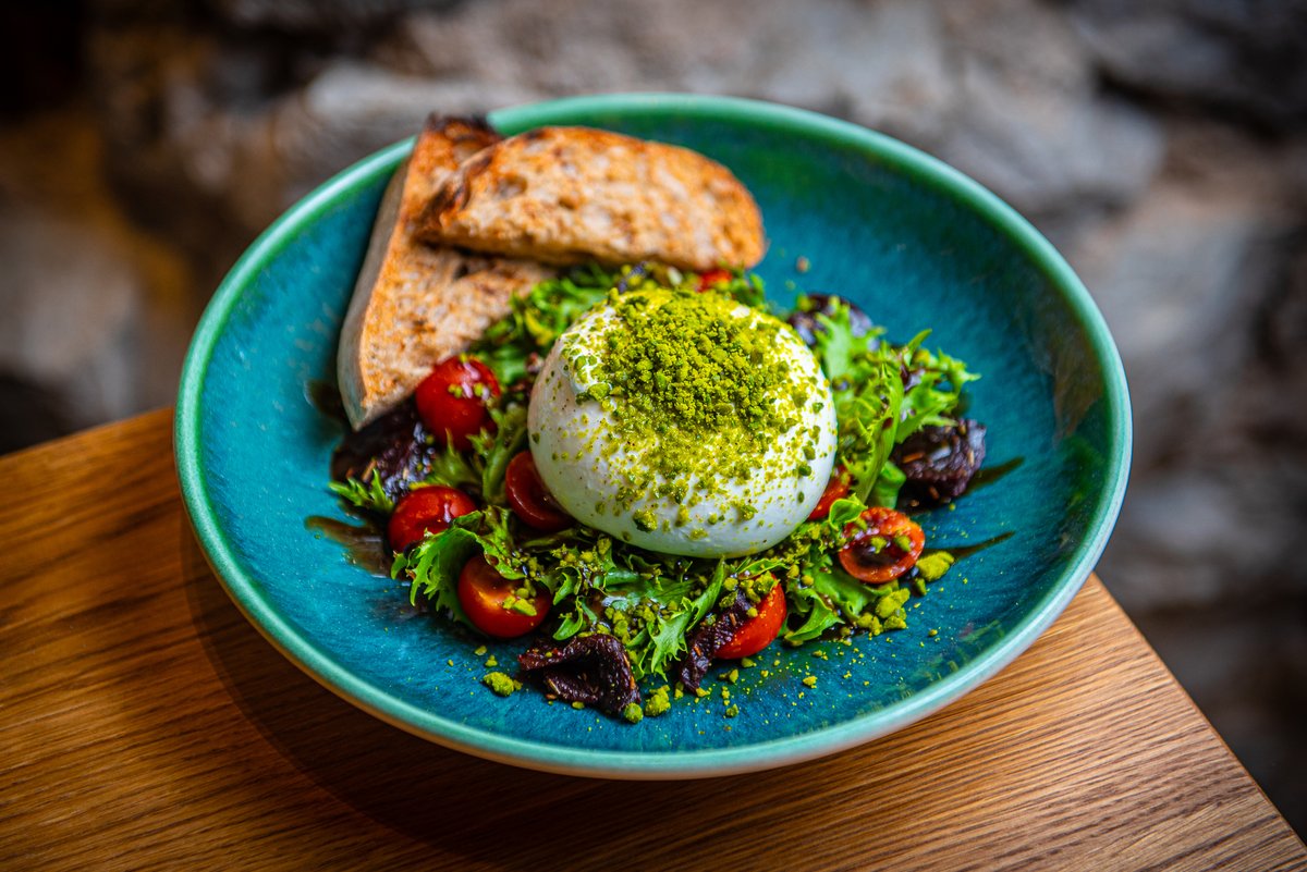 Burrata juust, kirsstomatid, röstitud peet, värske salat, pistaatsiapähklid ja balsamico kaste Burrata cheese with cherry tomatoes, roasted beetroot, pistachios and balsamic dressing