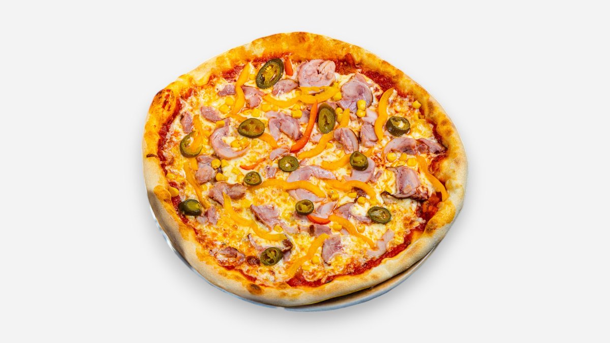 Tomatikaste, mozzarella, suitsukana, paprika, mais, jalapeno Tomato sauce, mozzarella, smoked chicken, bell pepper, corn, jalapeño