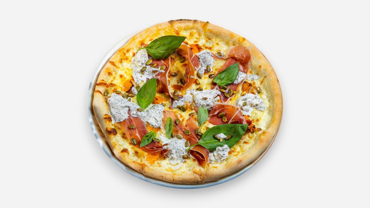 Mozzarella, crudo sink, trühvel, grillitud kunigservik, värske basiilik, trühvliõli, Parmigiano reggiano Tomato sauce, fior di latte, crudo ham, truffle, grilled oyster mushroom, fresh basil, truffle oil, Parmigiano reggiano