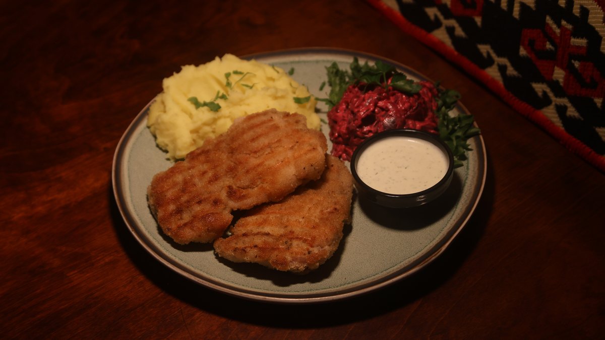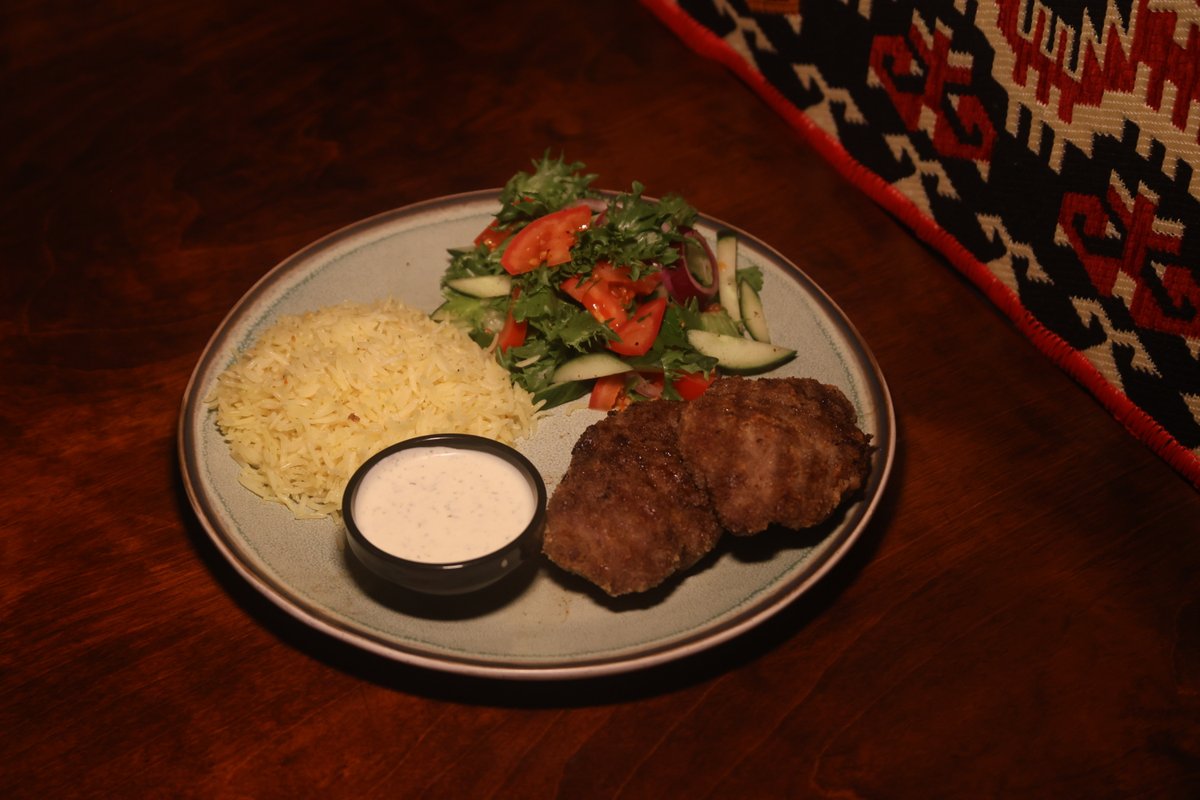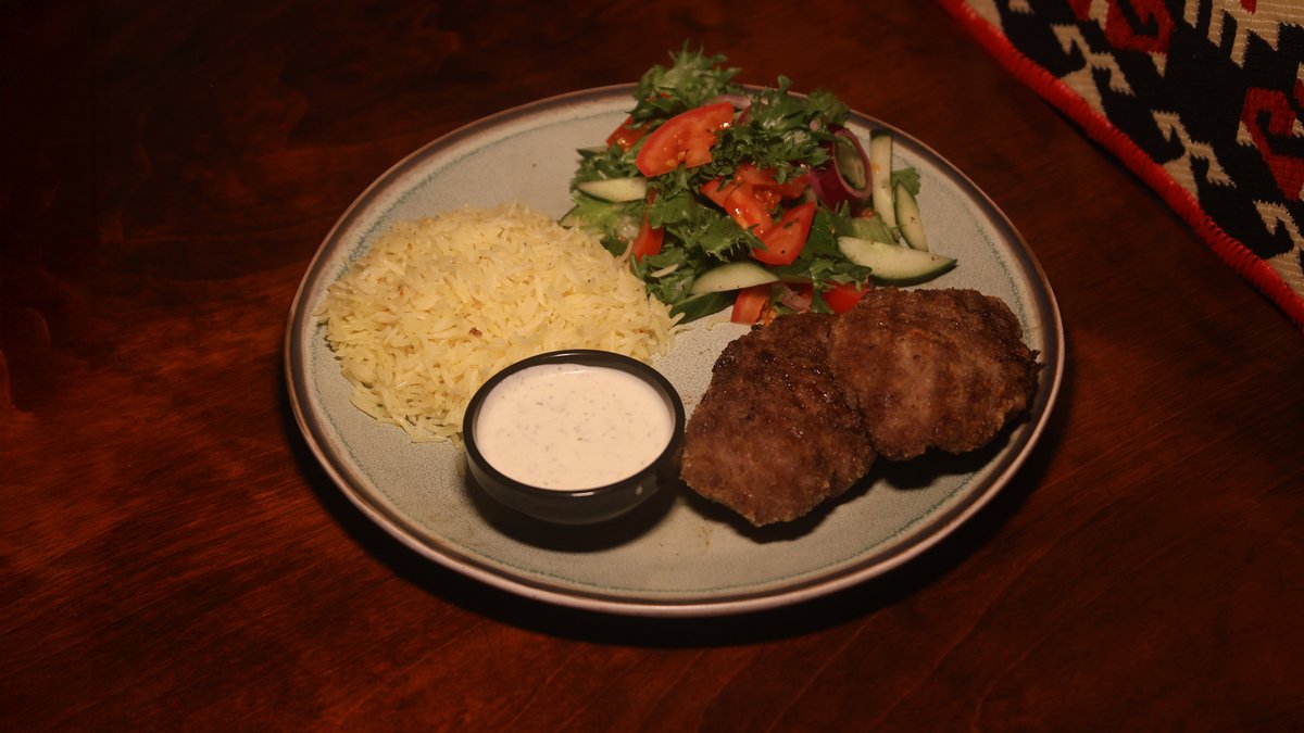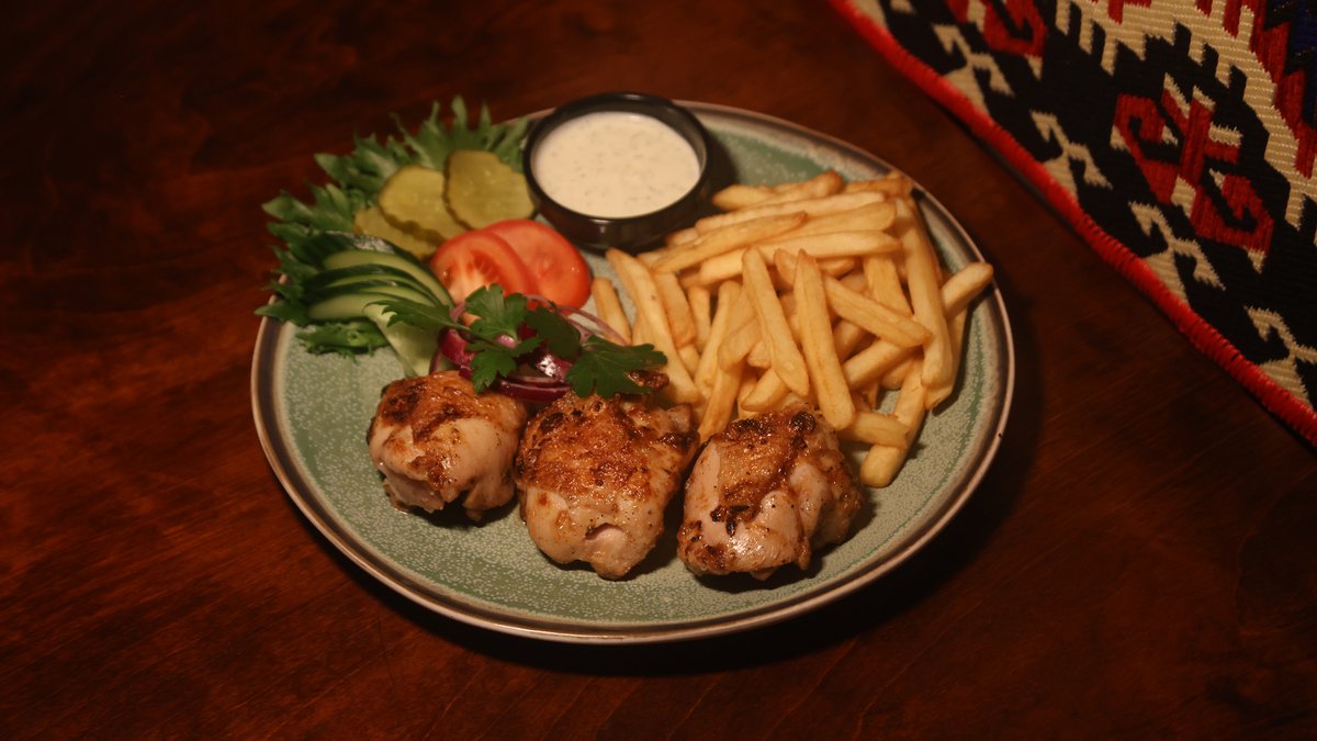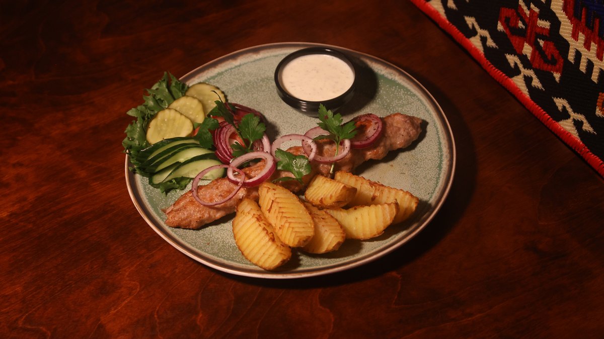 Kanašašlõkk kintsulihast friikartulite ja värske salatiga